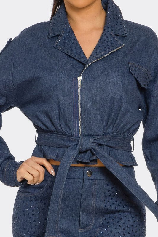 Turn heads and shine with this stunning denim duo! Perfectly crafted with stretch denim for comfort, rhinestone accents for sparkle, and chic details that make it a must-have for your wardrobe.