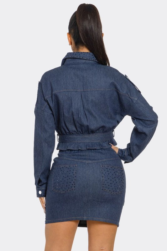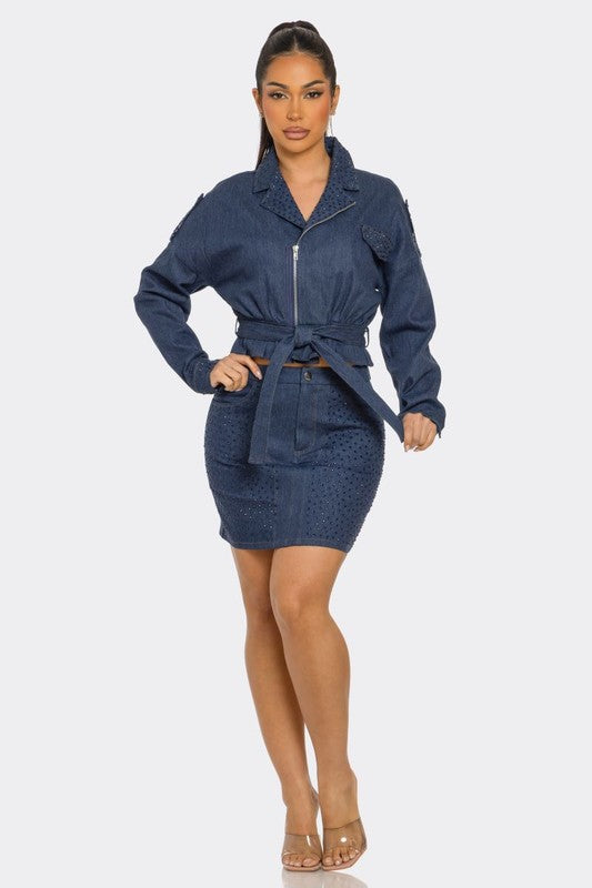 Embellished Denim Jacket & Skirt Set with Rhinestones β¨