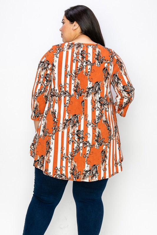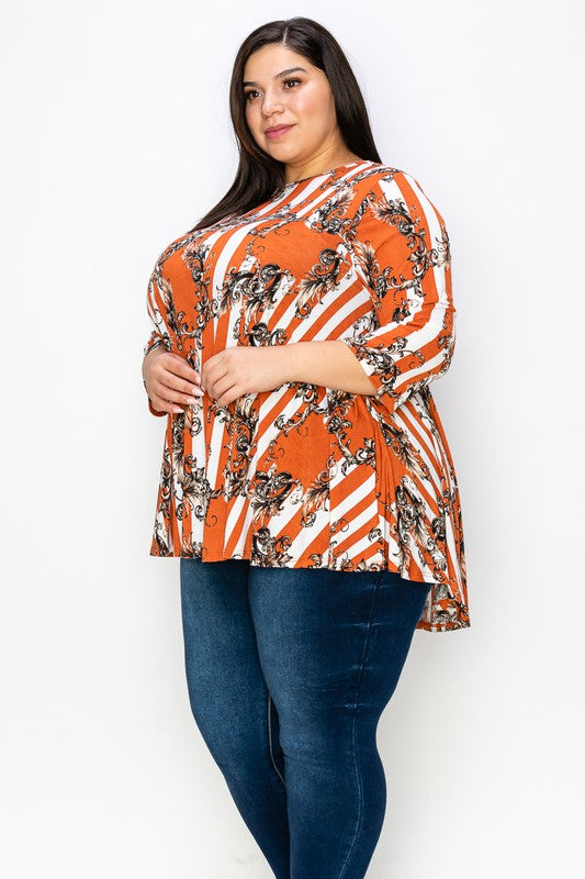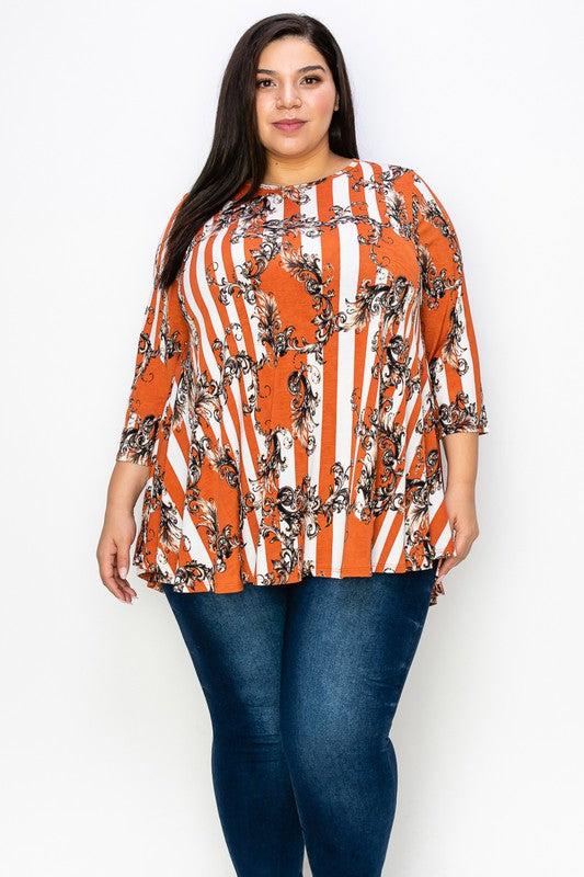 Breezy days call for effortless style, and our Plus Size 3/4 Sleeves Stripe Print Tunic Top delivers just that. With its bold stripe design and flattering tunic length, this top is perfect for layering or wearing on its own. The 3/4 sleeves add the right balance of coverage and comfort, while the soft, stretchy fabric makes it a go-to for both casual and chic looks.